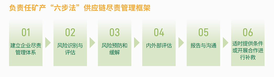 公司遵循《經濟合作與發展組織受沖突影響和高風險區域礦石負責任的供應鏈盡職調查指南(第三版)》《中國對外礦業投資行業社會責任指引》《中國礦產供應鏈盡責管理指南(第二版))等文件,于內部制定了《負責任礦產資源供應鏈管理政策》等文件,并基于政策要求供應商簽署《供應商行為準則》《不使用沖突礦產承諾書》邀請供應商填寫礦物報告、KYS 等調查表,引導和規范上游鋰礦供應商行為,完善鋰供應鏈盡責管理,鼓勵其承擔更多的環境和社會責任。